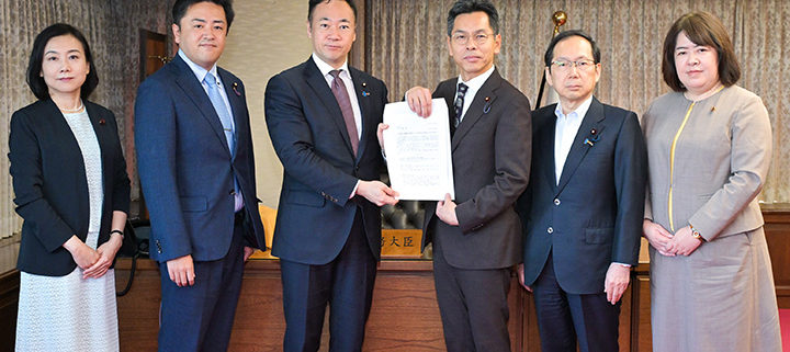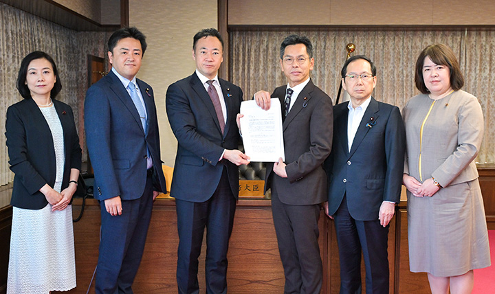 鈴木法相(中央左)に提言を申し入れる平林部会長(右隣)ら=8日 法務省