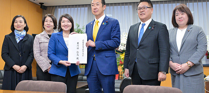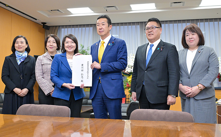 公明党女性委員会の竹谷とし子委員長(代表代行)らは28日、内閣府で黄川田仁志男女共同参画担当相に対し、政府や自治体、企業などが2026年度からの5年間で取り組むべき指針となる第6次男女共同参画基本計画に具体策を反映させるよう提言した。黄川田担当相は提言を踏まえ「実現に向け頑張りたい」と応じた。