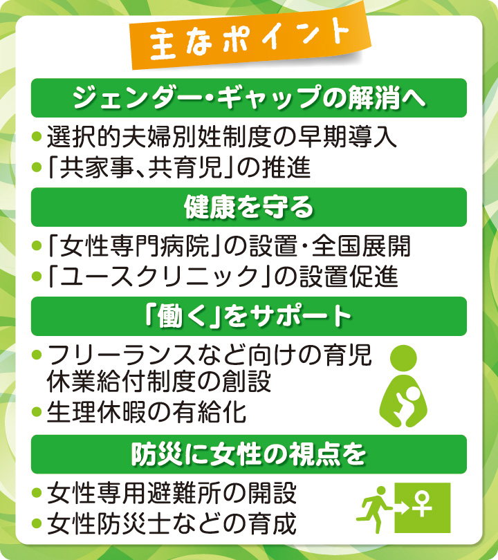 生涯を通じた女性の健康支援に向け、「女性の健康包括的支援法(仮称)」の制定と、性差に基づく医療を提供する「女性専門病院(仮称)」の設置・全国展開を提唱。また、SRHR(性と生殖に関する健康と権利)の視点から、プレコンセプションケア(将来の妊娠のための健康管理)の推進や、緊急避妊薬(アフターピル)へのアクセス改善を求めました。